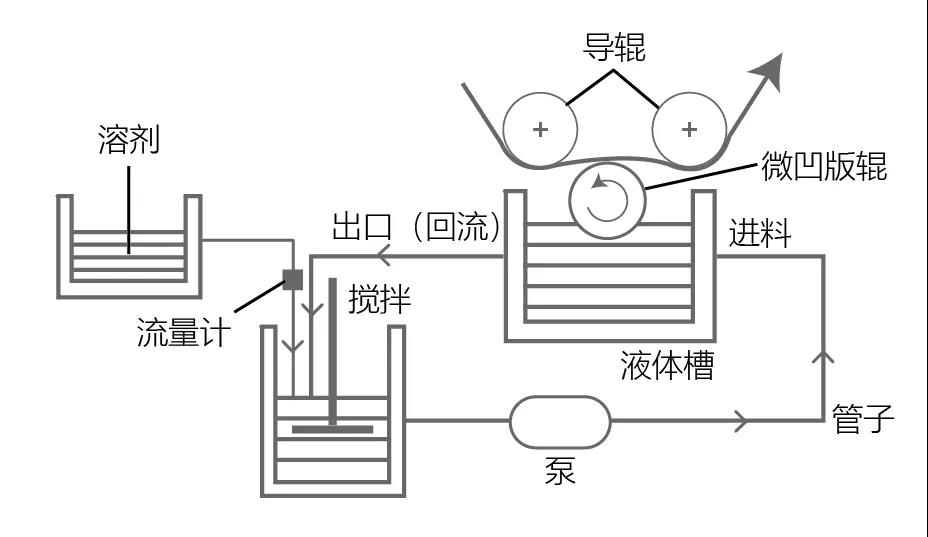 為了解決這個(gè)問題,可以在使用微凹的時(shí)候,進(jìn)行回流,使得涂布液處于一個(gè)流動(dòng)的狀態(tài),不容易結(jié)皮,同時(shí)在回流的時(shí)候根據(jù)溶劑的揮發(fā)速率進(jìn)行溶劑的補(bǔ)充,從而進(jìn)一步降低溶劑揮發(fā)所帶來的影響。